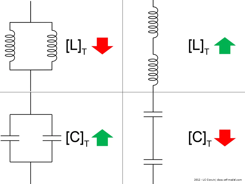 C stands for Capacitance regarding Capacitors, L for Inductance regarding Inductance. Both increase and decrease dependent on either serial or parallel circuitry.