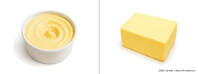 Spread refers to the act of applying butter or margarine onto bread or other food items. While butter is made from milk, margarine is made from vegetable oils.