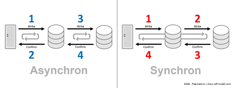 Asynchronous replication delays data transfer for efficiency. Synchronous ensures real-time sync for consistency.