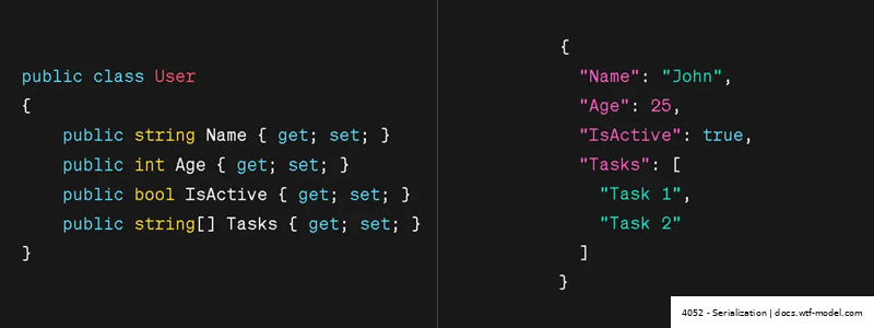 4052 - SerializationLast Update: 26.06.2025ShareMaturityBasicScopeFlowCycleCenterJSON StringPeripheryClass ObjectsCC-BY-NC-ND Philipp ElhausOriginalSerialization in C# converts class objects into JSON format for data interchange.LinksSerialization WARNING: This entry is marked as experimental/in development.