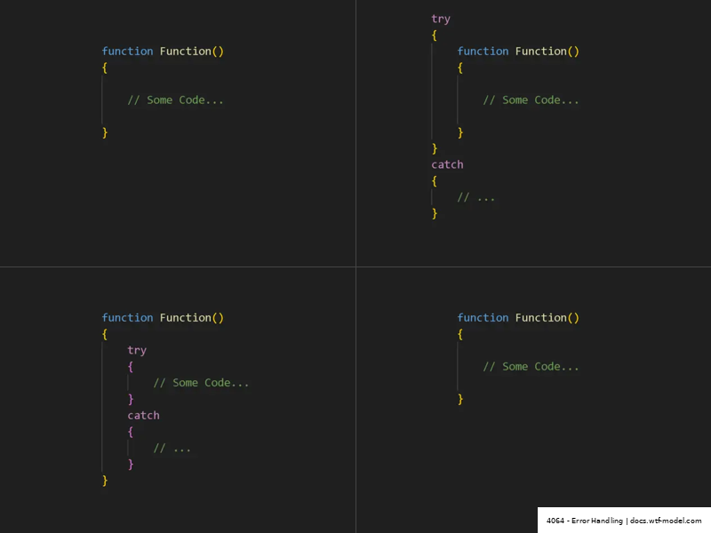 No try-catch: Fast, simple, but exceptions bubble up. Full internal try-catch: Local control, slight overhead, robust. External try-catch: Clean method, caller handles, flexible but risks inconsistency.